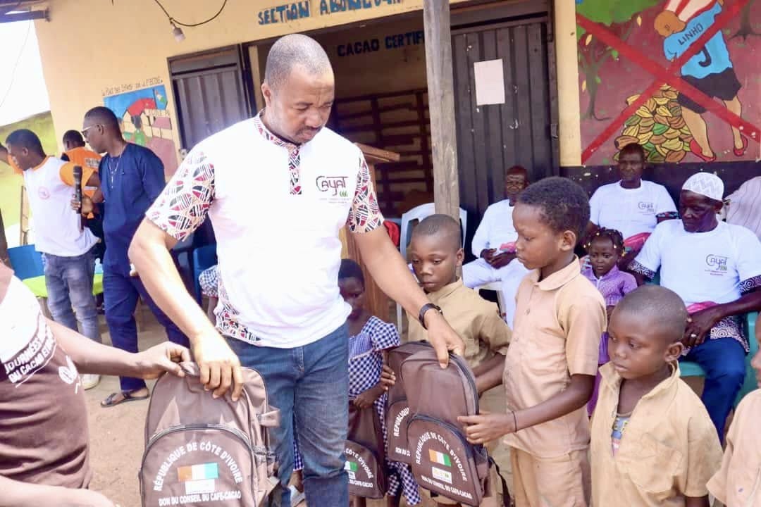 Dans le cadre de notre lutte contre le travail des enfants, CAYAT a fait don de kits scolaires aux enfants ainsi que de brouettes aux parents dans le village d'Abongoua, dans le département de Yakassé-Attobrou.